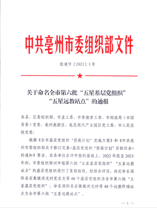 近日,亳州市委組織部印發(fā)《關(guān)于命名全市第六批“五星基層黨組織”“五星遠(yuǎn)教站點(diǎn)”的通報(bào)》(組通字〔2023〕3號),亳蕪?fù)顿Y公司黨支部榮獲亳州市第六批“五星基層黨組織”榮譽(yù)稱號。